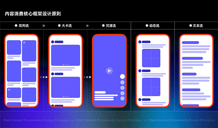 同时,细分用户不同的产品需求,淘宝团队整合分析出了5个核心体验框架:分别为双列流、大卡流、沉浸流、动态流以及文本流。