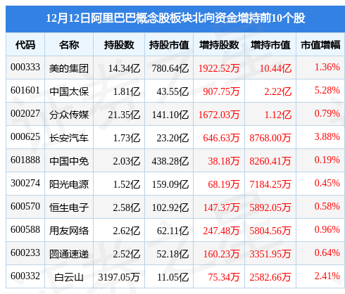 北向资金方面,当日阿里巴巴概念股板块北向资金持股市值为2486.99亿元,增持13.51亿元。其中增持最多的是美的集团,增持了10.44亿元。减持持最多的是海尔智家,减持了1.9亿元。阿里巴巴概念股板块北向资金持股变动明细见下表: