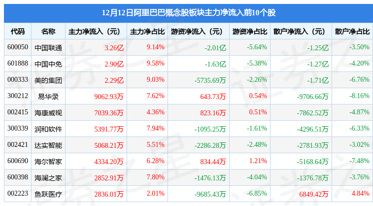 从资金流向上来看,当日阿里巴巴概念股板块主力资金净流出9.93亿元,游资资金净流出6045.02万元,散户资金净流入10.53亿元。阿里巴巴概念股板块个股资金流向见下表: