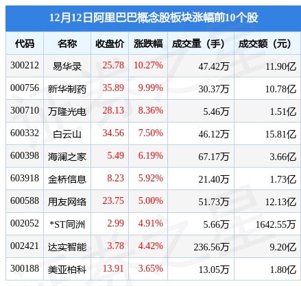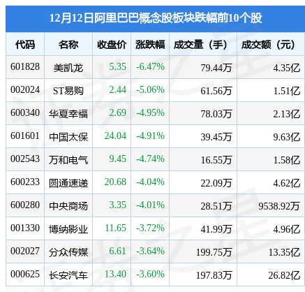 12月12日阿里巴巴概念股板块较上一交易日下跌0.6%,美凯龙领跌。当日上证指数报收于3179.04,下跌0.87%。深证成指报收于11399.14,下跌0.89%。阿里巴巴概念股板块个股涨跌见下表: